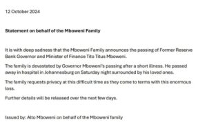 According to a statement released late on Saturday night, Mboweni passed away in a Johannesburg hospital, surrounded by loved ones.
